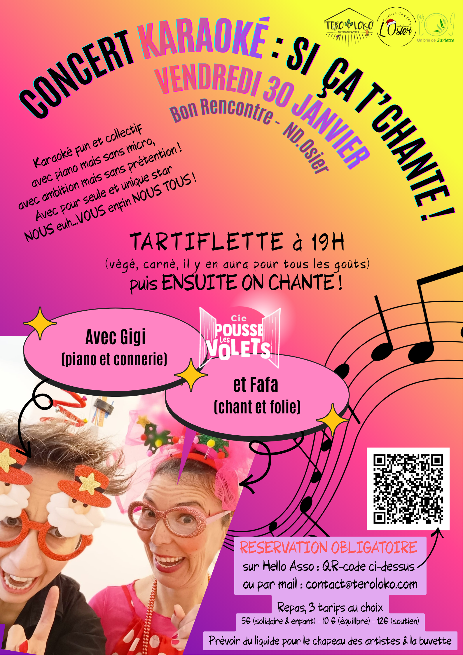 Soirée avec la Compagnie "Pousse les volets", Peggy Lagay (piano et connerie) et Raphaëlle Jay (chant et folie). Karaoké fun et collectif avec piano mais sans micro, avec ambition mais sans prétention. Avec pour seule et unique star NOUS euh…VOUS enfin NOUS TOUS ! Gigi et Fafa vous embarquent dans un tourbillon de tubes en… Lire la suite »Soirée Karaoké & Tartiflette |
